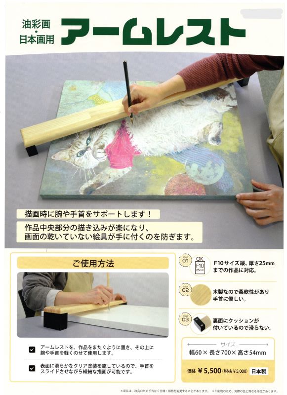 「アームレスト2種類&リストレスト」 アームレスト<油彩画・日本画用>と<イラスト・水彩画用>の2種類と、キーボード用「木製リストレスト」が販売中! ・アームレスト 描画時に腕や手首をサポートします。作品中央部の描き込みや、細部の描き込みが楽になり、画面の乾いていない絵具が手に付くのを防ぎます。アームレストを作品をまたぐように置き、その上に腕や手首を軽く乗せて使用します。表面に滑らかなクリア塗装を施しているので、手首をスライドさせながら繊細な描画が可能です。 <油彩画・日本画用>はF10縦サイズで厚さ25㎜までの作品に対応。<イラスト・水彩画用>はA4縦サイズで厚さ2㎜までの作品に対応。 ・キーボード用「木製レストリスト」 デスクとキーボードとの段差が無くなり、手首や指先の負担が軽減されます。接地面から3㎜の余裕があるので、書類がすき間に入り効率的に作業ができます。L(45㎝)とM(37㎝)の2サイズがあります。 #岡崎市彩雲堂 #ギャラリー彩雲堂 #岡崎市 #岡崎市康生 #岡崎市画材 #岡崎市画廊 #岡崎市絵画教室 #岡崎市額縁 ![]() ![]() ![]() 今週のギャラリーもご覧下さい(左上のリンクより) 岡崎商業高校さんの3年生の授業で「情報発信をビジネスにつなげよう!」という課題授業研究にて当店のPR動画を作っていただきました。