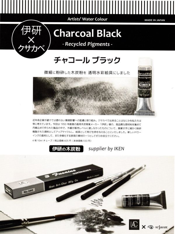 「伊研×クサカベ チャコール2種」 ≪アーティスト透明水彩絵具Charcoal(チャコール)≫ チャコールシリーズは、木炭の端材をアップサイクルした顔料を使用した透明水彩絵具。落ち着いた色合いとほのかに表れる木炭粉が特長。「グロウ」シリーズは光輝性顔料を含んだ華やかで上品な色調です。 ・チャコールカラーシリーズ 全12色 4号10ml ¥605(税込) ・チャコールグロウシリーズ 全6色 4号10ml ¥825(税込) ≪チャコールブラック≫ 木炭専業メーカー「伊研」の高品質な原材料を集めて丹精込めて作られた製品の中で、外観が販売レベルに達しなかったものについて、廃棄せずに細かく粉砕精製された木炭粉を顔料としてアップサイクルし、透明水彩絵具として再び生命を与えることにいたしました。 ・4号 10mlチューブ ¥605(税込) #岡崎市彩雲堂 #ギャラリー彩雲堂 #岡崎市 #岡崎市康生 #岡崎市画材 #岡崎市画廊 #岡崎市絵画教室 #岡崎市額縁 ![]() ![]() 今週のギャラリーもご覧下さい(左上のリンクより) 岡崎商業高校さんの3年生の授業で「情報発信をビジネスにつなげよう!」という課題授業研究にて当店のPR動画を作っていただきました。