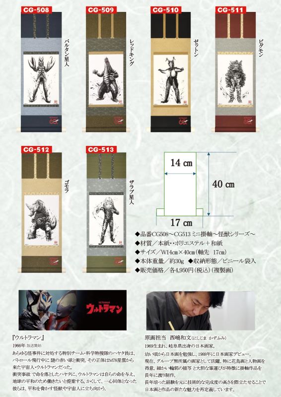 「ウルトラマンシリーズ 60周年記念掛軸 発売開始!」 ウルトラマン60周年記念といたしまして、掛軸・額装・ミニ軸の発売を開始します。期間限定品となっていますので、お早目にご注文をお願いします。 ・ウルトラマン/バルタン星人 尺五立掛軸 シリーズ開始から60年、世代を超えて愛され続ける「ウルトラマン」が日本の伝統美と融合した記念掛軸として甦ります。 本作は日本画家「西嶋和文」による水墨の力強い筆到で描かれた「ウルトラマン」とその宿敵「バルタン星人」を主軸に、掛軸という表現形式に昇華。ヒーローの躍動感と怪獣の存在感を墨の濃淡と余白により見事に表現しています。掛軸の生地には、落ち着きと気品を感じさせる意匠を採用。和の空間はもちろん、現代的なインテリアにも自然に調和し、壁面に確かな存在感をもたらしてくれる逸品です。各¥88.000(税込) ・ウルトラマン/ゼットン 本金押箔アート額装 日本が誇るヒーロー・ウルトラマンと、最強の宇宙恐竜ゼットンが、美しい日本画の世界に新たな姿で甦ります。原画は日本画家・西嶋和文による完全描き下ろし。ウルトラマンの凛とした佇まいと、ゼットンの圧倒的な存在感を贅沢に施された本金箔と繊細な描写によって表現しました。光を受けて輝きを変える本金箔が画面に奥行きと荘厳さを与え、緊張感あふれる対峙の瞬間をより劇的に演出しています。¥132.000(税込) ・ウルトラマン 怪獣ミニ掛軸シリーズ 高精細美術印刷でバルタン星人、レッドキング、ゼットン、ピグモン、ゴモラ、ザラブ星人の6種類がコンパクトなミニ軸になって登場。サイズは40㎝×14㎝(軸先17㎝)。各¥4.950(税込) #岡崎市彩雲堂 #ギャラリー彩雲堂 #岡崎市 #岡崎市康生 #岡崎市画材 #岡崎市画廊 #岡崎市絵画教室 #岡崎市額縁 ![]() ![]() ![]() ![]() ![]() ![]() 今週のギャラリーもご覧下さい(左上のリンクより) 岡崎商業高校さんの3年生の授業で「情報発信をビジネスにつなげよう!」という課題授業研究にて当店のPR動画を作っていただきました。
