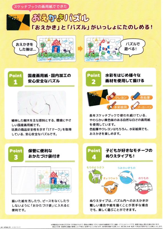 「おえかきパズル」 「おえかき」と「パズル」が一緒に楽しめる! 図案スケッチブックの画用紙から生まれたパズルで、おえかきをした後はパズルで遊べる(60ピースと30ピース) ・植林した樹木を主な原料とする、環境に優しい国産画用紙です。玩具の商品安全性を示す「STマーク」を取得している安心安全なパズルです。 ・長年スケッチブックで使われ続けている、やわらかい黄色味のある自然な白さの画用紙を使用しています。色鉛筆やクレヨン、水彩絵具、マーカーペンなどでおえかきを楽しめます。 ・描いた絵を汚したり、ピースを無くしたりしないように「おかたづけ袋」に入れると便利です。 ・小さなお子さまでも遊びやすい塗り絵タイプを4種類ご用意(60ピースと30ピース各2種類)。塗り絵タイプは、パズル内へのおえかきが難しい場合や絵を描くことが苦手な場合でも楽しく遊ぶことが出来ます。 #岡崎市彩雲堂 #ギャラリー彩雲堂 #岡崎市 #岡崎市康生 #岡崎市画材 #岡崎市画廊 #岡崎市絵画教室 #岡崎市額縁 ![]() ![]() 今週のギャラリーもご覧下さい(左上のリンクより) 岡崎商業高校さんの3年生の授業で「情報発信をビジネスにつなげよう!」という課題授業研究にて当店のPR動画を作っていただきました。