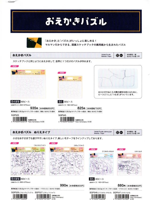 「おえかきパズル」 「おえかき」と「パズル」が一緒に楽しめる! 図案スケッチブックの画用紙から生まれたパズルで、おえかきをした後はパズルで遊べる(60ピースと30ピース) ・植林した樹木を主な原料とする、環境に優しい国産画用紙です。玩具の商品安全性を示す「STマーク」を取得している安心安全なパズルです。 ・長年スケッチブックで使われ続けている、やわらかい黄色味のある自然な白さの画用紙を使用しています。色鉛筆やクレヨン、水彩絵具、マーカーペンなどでおえかきを楽しめます。 ・描いた絵を汚したり、ピースを無くしたりしないように「おかたづけ袋」に入れると便利です。 ・小さなお子さまでも遊びやすい塗り絵タイプを4種類ご用意(60ピースと30ピース各2種類)。塗り絵タイプは、パズル内へのおえかきが難しい場合や絵を描くことが苦手な場合でも楽しく遊ぶことが出来ます。 #岡崎市彩雲堂 #ギャラリー彩雲堂 #岡崎市 #岡崎市康生 #岡崎市画材 #岡崎市画廊 #岡崎市絵画教室 #岡崎市額縁 ![]() ![]() 今週のギャラリーもご覧下さい(左上のリンクより) 岡崎商業高校さんの3年生の授業で「情報発信をビジネスにつなげよう!」という課題授業研究にて当店のPR動画を作っていただきました。